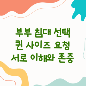 부부가 함께 사용할 수 있는 퀸 사이즈 침대가 있다면 이를 요청하는 것이 좋습니다. 퀸 사이즈 침대는 부부가 충분한 공간을 확보할 수 있어 편안한 수면을 취할 수 있습니다. 하지만 호텔이나 숙박 시설에 따라 퀸 사이즈 침대가 없는 경우도 있으므로 사전에 확인이 필요합니다.